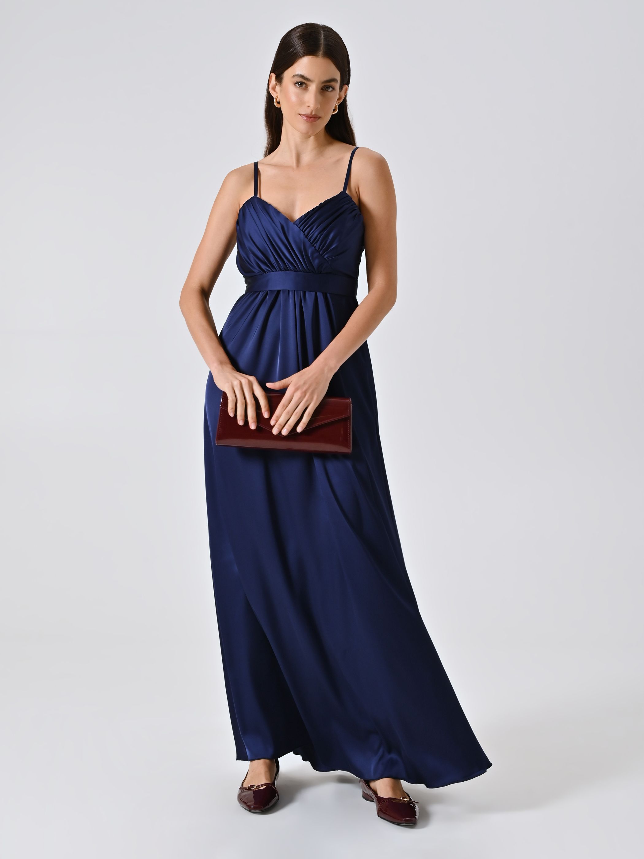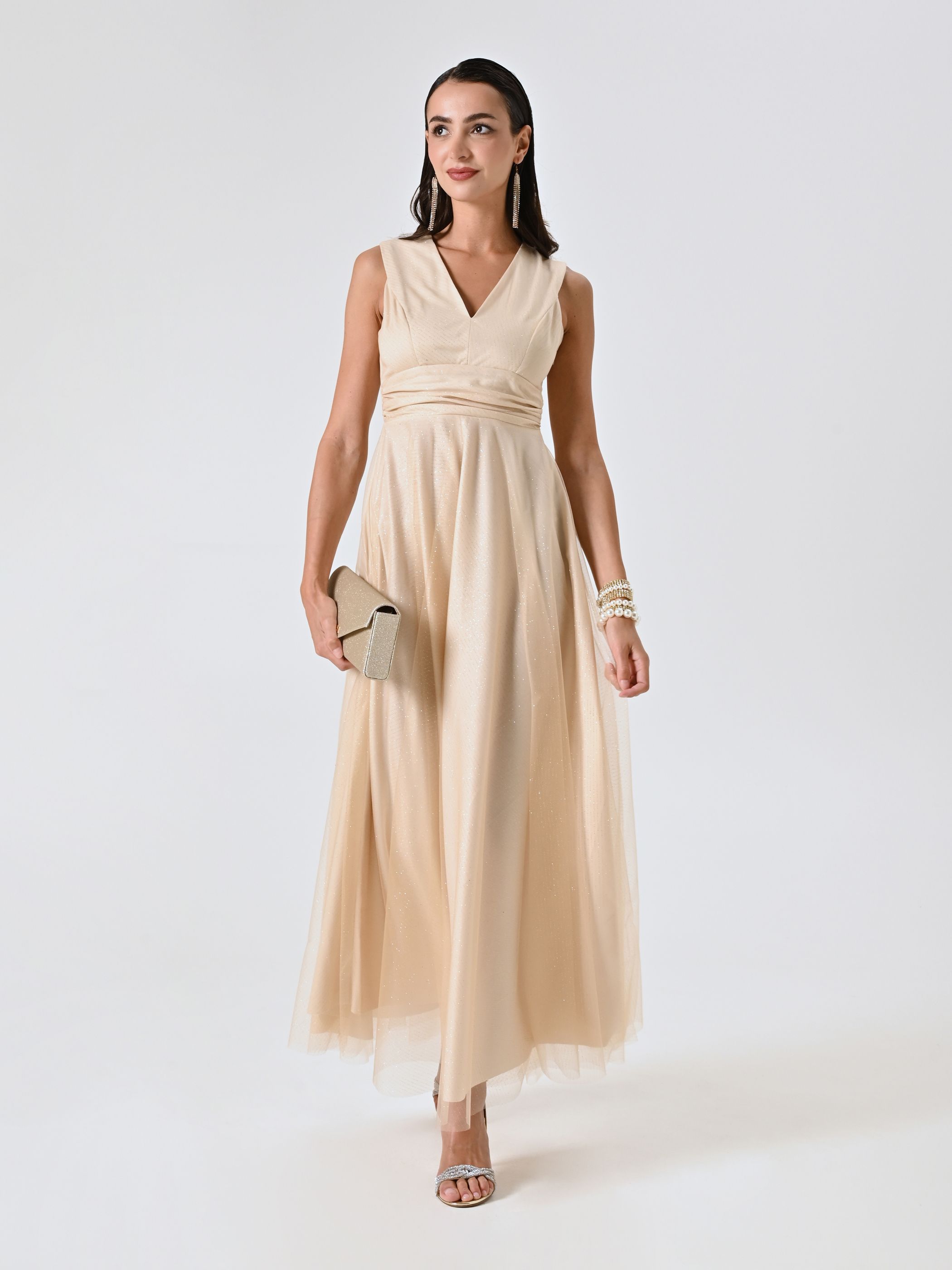 Este vestido largo está pensado para acompañarte con elegancia en ceremonias y momentos especiales. Con él irradiarás feminidad a través de detalles refinados y un corte fluido. Su confección en georgette azul presenta una estructura de escote en pico drapeado decorado con flores tridimensionales cosidas, cinturilla que realza la figura y unas cintas finas en la espalda. Destaca también por el cierre de cremallera y lazo, que refuerza la discreción del diseño. Combina de maravilla con una estola ligera o una blazer de la colección, en un look que podrás completar con calzado y accesorios elegantes. ¿Y para conseguir un ajuste impecable? Entonces elige piezas de lencería de la colección Rinascimento Lingerie. ¡Lúcelo en una ceremonia o un evento especial para brillar con un estilo romántico y refinado!